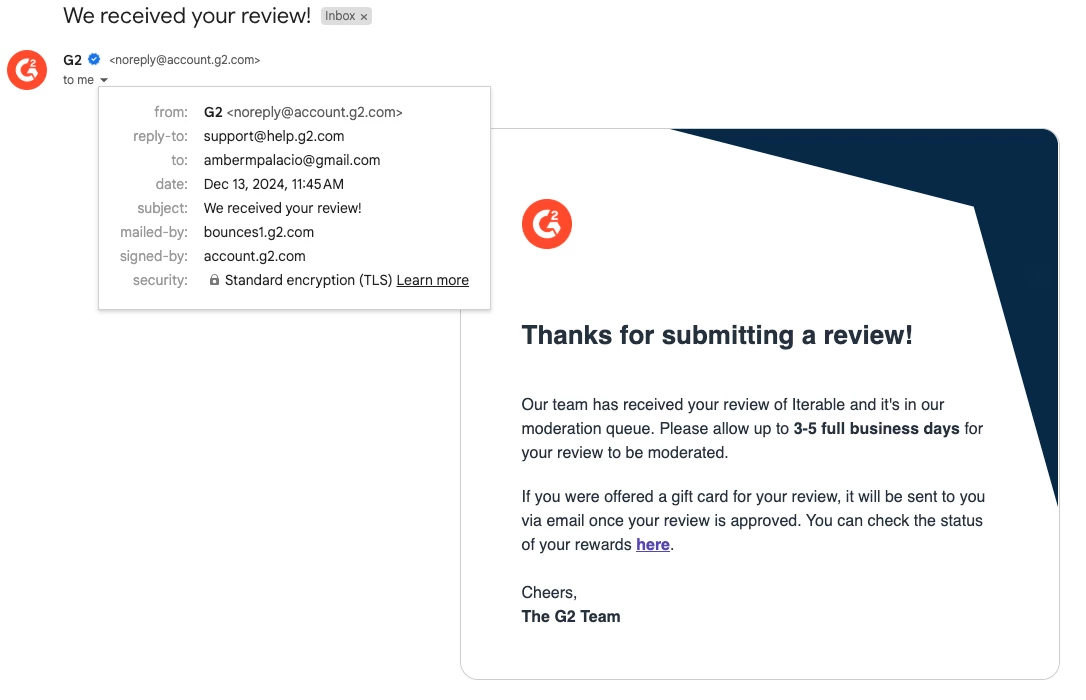 - 🎁 As a thank you gift: Once your review is approved by G2, you’ll receive a $25 gift card of your choice. Just in time for the holidays!
