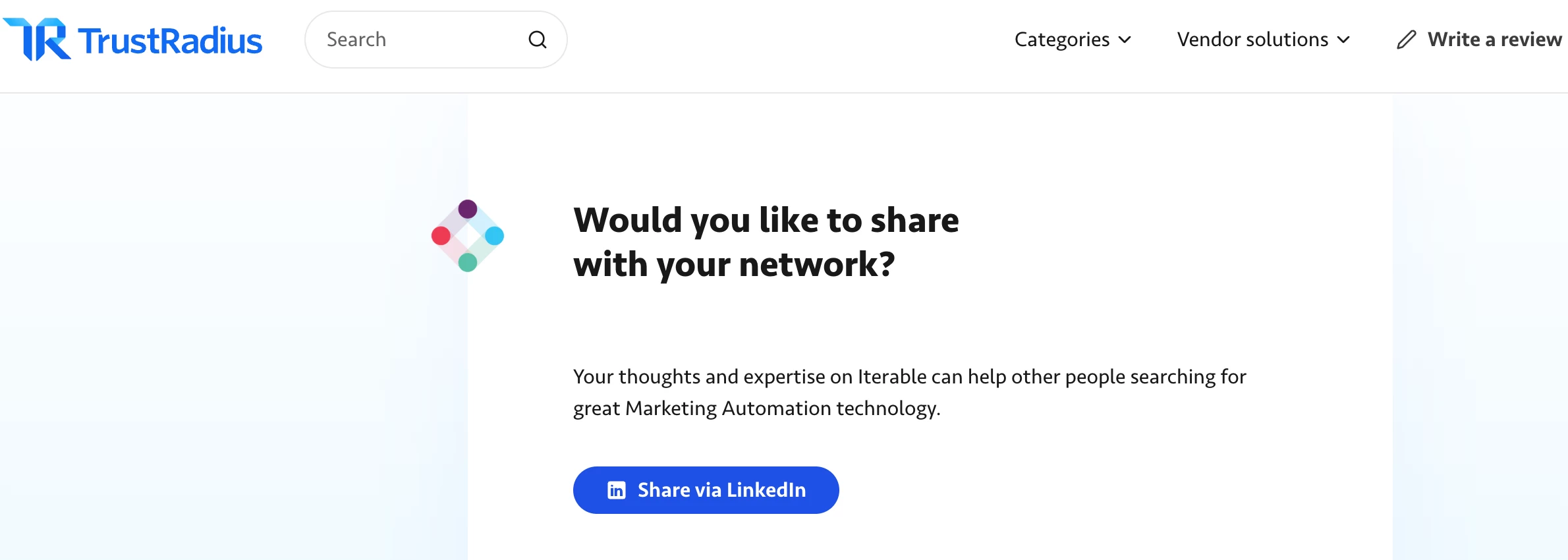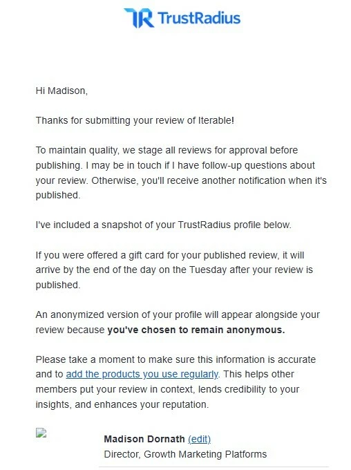 It wouldn’t be Trail Tales & Reviews without us asking for a review from our customers! 😄 Help other marketers discover Iterable by writing a quick review on TrustRadius. It can be anonymous! Think of Trustradius like Yelp, but for B2B software.