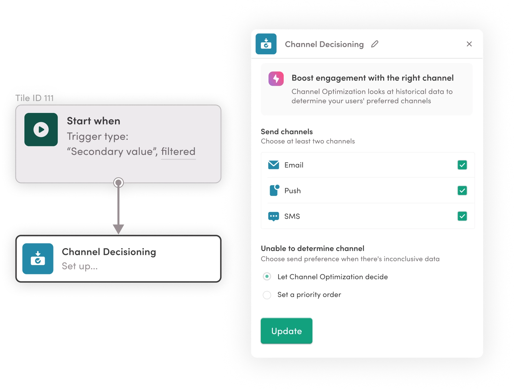 Channel Decisioning evaluates engagement patterns across channels and selects the one each customer is most likely to respond to, removing the need for rigid channel logic.