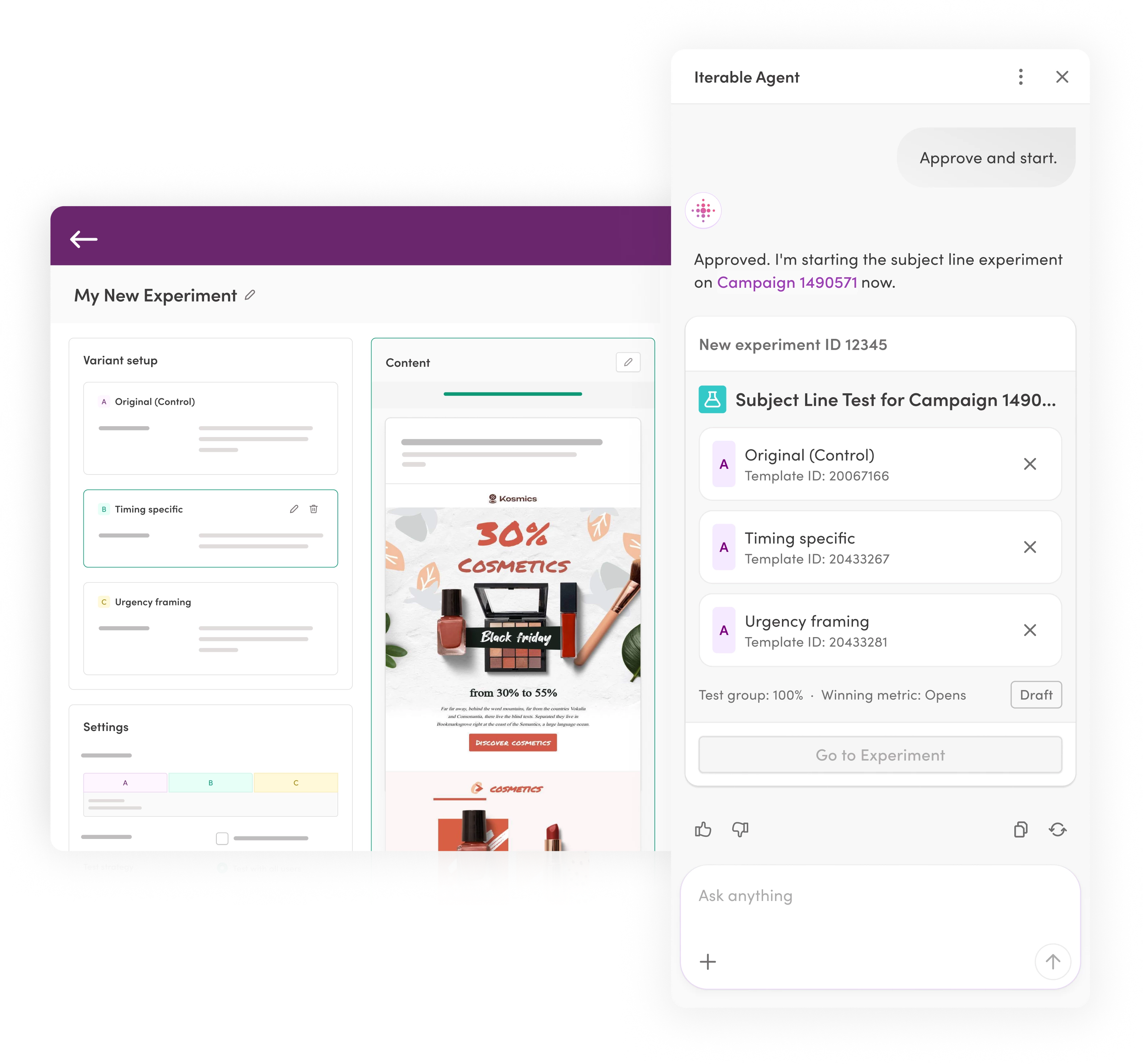 Coming this April, we’re expanding Iterable’s AI agent ecosystem with new capabilities to help teams move faster and optimize smarter, including Experimentation Agent, designed to automatically generate, test, and optimize campaign variations to improve engagement and conversion.